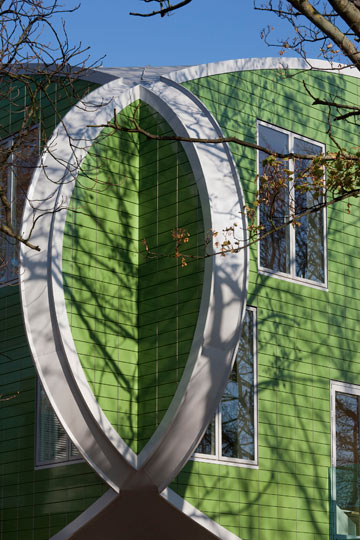 המבנה בן שתי הקומות ממוקם על מדרון הסמוך לבית החולים האזורי. טופוגרפיית המדרון איפשרה לבניין להיות מורם מעל הקרקע, ובעזרת העצים הסוככים על החלונות ועל המרפסות מתאפשרת פרטיות. למבנה צורה סימטרית, המתקבלת באמצעות ארבעה קירות אליפטיים הנדמים כחותכים זה את זה. מן המטבח וחדרי הישיבה יוצאות מרפסות מרובעות, ששוברות מעט את הצורה העגולה ומאפשרות תצפית אל הנוף. החזיתות האליפטיות מצופות אריחי קרמיקה בצבע ירוק בהיר ("כדי למשוך מבקרים", הסביר גאף), דבר שמוסיף עוד נדבך למראה הלא שגרתי.