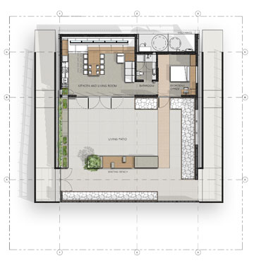 בהתאם לכללי התחרות, המבנה יוצב על מגרש מרובע שמידותיו 24 מטרים על 24 מטרים. מכיוון שחלל המגורים מתוכנן לזוג, הוחלט שרק 70 מטרים רבועים יהיו סגורים ומקורים (הם כוללים סלון, מטבח, חדר שינה ואמבטיה). חלל האירוח המרכזי נמצא בחוץ - מין פטיו, המשתרע על פני 125 מ"ר. זאת החלטה תכנונית "שגם הסינים מאוד אהבו", מספרים הסטודנטים, ומסבירים זאת בכך שהתרבות הסינית מייחסת חשיבות רבה לחצר הבית. שני חלקי הבית, הפנימי והחיצוני, מוגבהים כמטר מעל לקרקע ובנויים על קונסטרוקציה קלה מפלדה, שעליה מונח חומר מבודד.