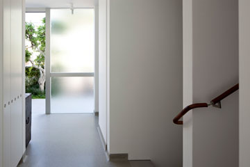 השילוב בין העכשווי למודרניזם הקלאסי בולט בבית, ששטחו 330 מ''ר, על מגרש של 300 מ''ר. אל דלת הכניסה מובילות ארבע מדרגות עשויות מיציקת טרצו, שמחפה גם את רצפת החלל. דלת האלומיניום הגדולה הוטמעה בתוך חלון שמחדיר למבואת הכניסה אור טבעי. משמאל לדלת שירותי האורחים, מימין לה הסלון. מסדרון קצר מוביל פנימה מעבר לגרם המדרגות, אל המטבח ופינת האוכל.
