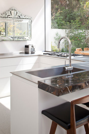 ארונות המטבח התחתונים תוכננו בצורת האות ח', ומוקמו מול חלון קבוע שנמתח מהרצפה עד לתקרה ופונה אל החצר האחורית. הארונות עשויים עץ צבוע לבן עם מעט ברק, ומעליהם משטח עבודה דק מנירוסטה. בקיר הארונות המלא הוסתרו מכשירי החשמל והמקרר. עמדת הכיריים פונה החוצה, ועל הקיר שמול דלפק הישיבה, המשמש לארוחות קלות, נתלתה מראה גדולה עם פיתוחים, שמשקפת את הבריכה. הדלפק חובר למשטח העבודה, והוא עשוי שיש בגוני חום ושחור. סביבו הוצבו כסאות מעץ חום עם מושבי עור שחורים, ואת החלל מאירים גופי תאורה גליליים לבנים.