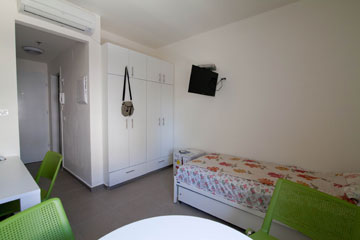 והכי חשוב – המטראז'. הדירות קטנטנות: 17 מ"ר ליחיד, כולל מטבחון ומקלחת; 27 מ"ר לזוג. כשהולכים במסדרונות הארוכים של המעונות, מתקבל הרושם של הוסטל, וכך נראים גם החדרים. אז נכון, מדובר בפתרון קל למי שלא רוצה לכתת רגליים בחיפושים. מבחינת מרחב המחיה, הוא לא בדיוק נוח.