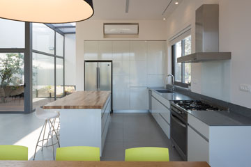 הצבעוניות בבית אחידה, לפי דרישת הלקוחות. האדריכלים תיכננו את כל פריטי הנגרות. "עודד ואני שיכנענו את מאיר שהכל יהיה חדש", אומרת בעלת הבית בחיוך. הארונות בחדרים נצבעו בתנור, המטבח חופה בפורמייקה לבנה, ופריטי נגרות נוספים מורכבים מעץ אלון. כל הבית חופה באריחים אפורים, כשהגודל משתנה בין החדרים הפרטיים למשפחתיים.