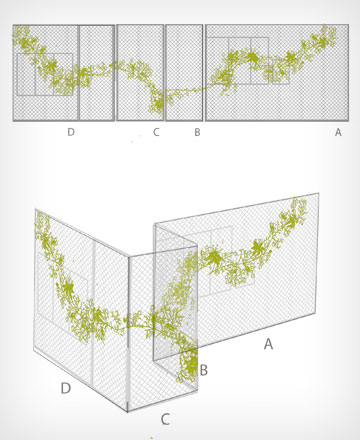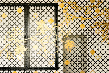 - רשת ברזל שחורה עם עלי זהב בחיתוך לייזר, ציפוי דלתות הפנים, עלי בננה ממתכת במרפסת וספריית מתכת ורודה בחדר העבודה: "סטודיו Fe" ו"amirp".