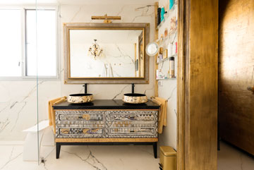 חדר הרחצה של לוסיה עוצב בלבן ושחור. רצפת השיש מטפסת על הקירות, ואת ארון הכיור החדש צבעה האמנית פטריציה גלמן בטקסטורה ובגוונים שמתאימים לצמד הכיורים שנבחרו. מקלחון גדול מוקף חלון בהיר, ומולו אמבטיה לבנה, שמעליה נברשת תפוחים ואגסים ממטבח דירתה הקודמת של לוסיה.