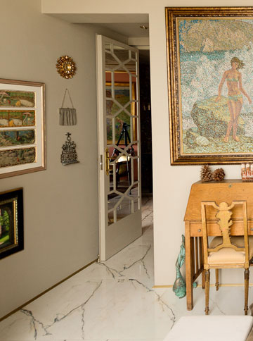 מאחר שאחת המשימות החשובות הייתה מלאכת התלייה והסידור של התמונות, נשכרו שירותיה של הגלריסטית קרן בר-גיל, שעשתה עבודת פינצטה בשיבוץ הפריטים. קומבינציה יפה, לדוגמה, נמצאת ליד דלת הכניסה לחדרה של הבת: זה מעל זה נתלו שלושה חפצים – מראה מוזהבת ועגולה שהבת קנתה בטיול בפרו, תיק ערב כסוף שהיה של אמה של לוסיה בשנות ה-40, וחנוכייה שקנתה במרוקו בשנות ה-70.