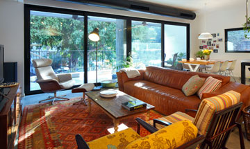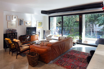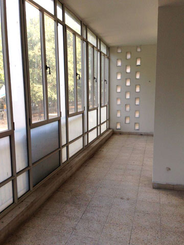 חלון זכוכית גדול מפריד בין החדר למרפסת חצי סגורה שצופה לרחוב קטן שיוצא מהשדרה. האור מסונן באמצעות קיר לבנים במראה שתי וערב, שאופייני לבנייה התל אביבית של שנות ה-50 ולוקח השראה מהמשרבייה האסלאמית.