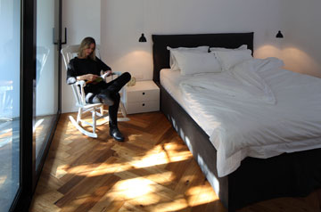 מסדרון מוביל לחדר ההורים, שסגנונו פשוט, כמעט נזירי: מיטה באפור כהה, מנורות קריאה שחורות, תלויות, וכיסא נדנדה לבן. הקירות לבנים ועל הרצפה פרקט מעץ אלון, בצורת אדרת דג (Fishbone).