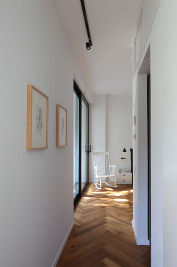 דלת הכניסה נפתחת אל מסדרון שמוביל לחלק המרכזי של הדירה, שרצפתו כוסתה בבטון מוחלק. מימין בולט עמוד בטון שנחשף בשיפוץ, והושאר כפי שהוא (עמודים דומים נמצאים בחדר הרחצה של הילדים ובמרפסת הגדולה). לצד העמוד יש דלת זכוכית ממוסגרת בפרופיל ברזל שחור, והיא מובילה לאגף ההורים, שמכיל פינת עבודה עם ספרייה, חדר רחצה, חדר ארונות וחדר שינה עם מרפסת צמודה.