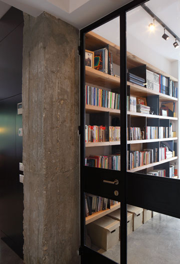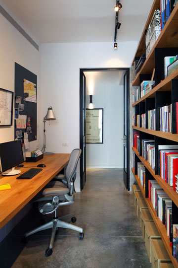 פינת העבודה צרה ומוארת בפס תאורה שחור שצמוד לתקרה. פלטת אלון גושני משמשת כשולחן ארוך, ומולה ספרייה ממדפי עץ שביניהם מחיצות ברזל שחורות. כך זה נראה מהצד השני: