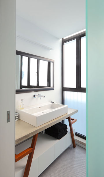 מול פינת העבודה נמצא חדר הרחצה של ההורים, שרוצף באריחי פסיפס אפורים. על רגלי עץ אלכסוניות הוצבה פלטה מבטון, ועליה הונח כיור מלבני. החדר מואר באמצעות חלון שנמתח מהרצפה עד התקרה: חלקו התחתון עשוי זכוכית חלבית, והעליון מזכוכית שקופה.