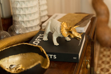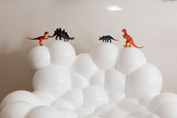 ממש כפי שהוא גדל, כך גם ילדיו של גאון, בן שלוש וחצי ובת 11 וחצי, חיים בטבעיות במחיצת אוסף רהיטי הגלריה של אבא, שגודש את הבית. "זה מקסים אותי", מחייך גאון בתשובה לשאלה איך כל זה מסתדר יחד, "כשאני רואה את הילדים מטפסים על הרהיטים, משתמשים בהם, מצלמים אותם, מקבלים אותם כחלק מהחיים שלהם וגם שומרים עליהם. דרך החיים היומיומיים לומדים לשמור ולהעריך. 'הפרה המשוגעת', כורסת הבועות של שמואל בן-שלום, היא המקום הכי אהוב לפזר עליו את אוסף הדינוזאורים". למי שמודאג משאלת הנוחות של הכורסה הקשיחה, נוסיף שפינת ההתרווחות בבית היא בחדר הילדים: שם נמצאת הטלוויזיה ושם נמצאת גם ספה רכה.