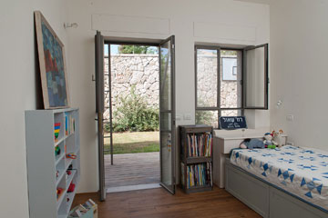 מתחת למדרגות המובילות לקומה העליונה נבנו מדפי ברזל. לאורך חדר ההורים מרפסת שצופה לנוף הפתוח, ומשלושת חדרי הילדים יציאה לגינה שפונה אל הרחוב. "ההחלטה לשלב את הבית בטופוגרפיה של המגרש יצרה חצר לכל חדרי הבית", מסבירה איכהולץ. בחדרי הילדים מיטות עץ משופצות, שבנה אביה של טלי ושימשו אותה ואת אחותה בילדותן.