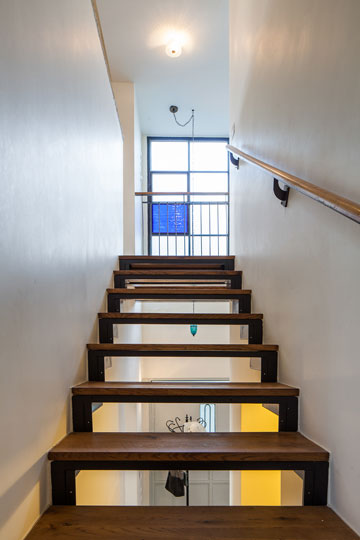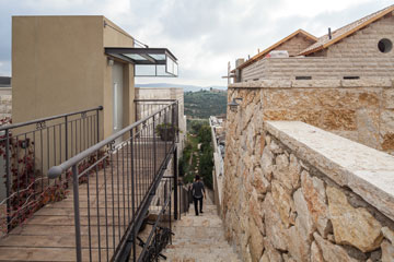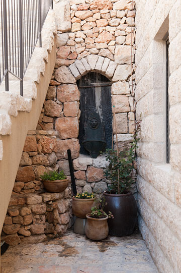 גרם מדרגות ארוך מלווה את הבית, שחופה באבן טובזה אפורה עם פוגות איטום רחבות במיוחד, שמזכירות את מבני האבן שנבנו בתחילת המאה ה-20. במורד גרם המדרגות, במפלס הכניסה, נבנה לצדו קיר עם חלון מקושת דקורטיבי, שאת האבנים סביבו מיקם הקבלן בעבודת יד שנמשכה חודש וחצי. "הוא שבר אבן אבן עד לתוצאה הרצויה", מתארת משורר את הטקסטורה שנוצרה, "מראה ישן שמכבד את ההיסטוריה והירושלמיות", כהגדרתה.