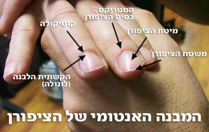 לגרום לחדירת זיהומים. "רצוי להימנע מלהתעלל באזור הציפורן", היא אומרת. "כסיסת ציפורניים היא הרגל מגונה ושכיח במיוחד אצל ילדים, שמעבירים כך זיהומים מהאצבע לפה ולהיפך. גם הסרת העור בבסיס הציפורן (קוטיקולה – ראו תמונה) היא הרגל מגונה, שמאפשר חדירת זיהומים".