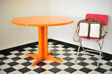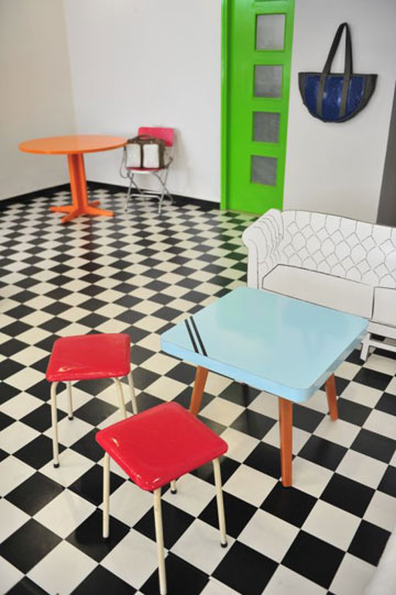 החלל רוצף בדוגמת שחמט של שחור לבן, במטרה להשאיר את הבמה לצבעוניות של התיקים והתכשיטים. הרהיטים נצבעו בצבעים עזים והתכשיטים מוצגים על כדורי "דשא". על הקירות איורי כסאות של גיא טמם, ובמרכז החלל ספת הנייר, במטרה להוסיף מימד של הומור כתוצאה מהמפגש בין הדו מימד לתלת מימד.