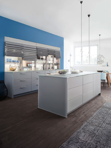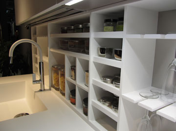 חברת Leicht הציגה דגם חדש של תריסים, Xtends (בתמונה הבאה), שבאמצעותם נעלמים הארונות העליונים ונוצר במטבח אזור חדש ופרקטי מאחורי הכיור שבקצה משטח העבודה. גם הטכנולוגיה הזו מתאפשרת על ידי העמקת החלק התחתון של המטבח.