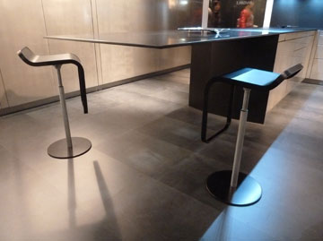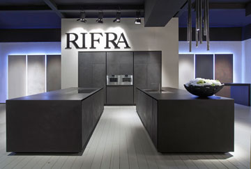 מספר חברות הציגו מטבחים בחיפויי אבן מסוגים שונים. בחברת Hacker (בתמונה הבאה) מצאנו אבן דקיקה במיוחד - 1.3 מ"מ (!) – שהודבקה לדלת MDF, כך שדלתות הארונות אינן כבדות אבל המראה הטבעי נשמר.