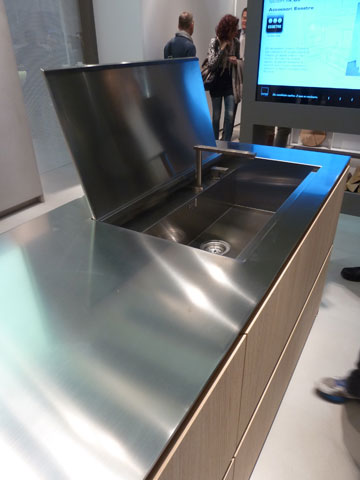 כיורים נסתרים, עם ברזים קופצים, נראו במספר מטבחים, בדרך כלל של Barazza (בתמונה למעלה). גם כאן מסתבכת הפעולה הפשוטה של שטיפת כלי בכיור. לדעתנו, זה מתאים לכיורים שאינם נמצאים בשימוש יומיומי. אנחנו גם סבורים שלפריטים הנסתרים האלה יש פוטנציאל להישאר גלויים בסופו של דבר, ובכך לייצר הפרעה גדולה יותר מזו שיוצרים הברז והכיור עצמם (כמו הקלאפה למיקרוגל בבית הישראלי, שבדרך כלל נשארת פתוחה תמיד).