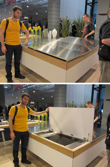 למעלה: משטח ענק שמסתיר מערכת כיריים אינדוקציה. שוב, תהינו מה היה קורה אם הכיריים היו נשארות חשופות. איזו שימושיות יש במשטח הענק כשהוא סגור? האם כשהוא פתוח נוצר אזור אכילה? ואם כן, היכן מסתירים את הכסאות?