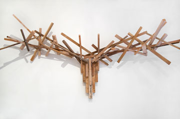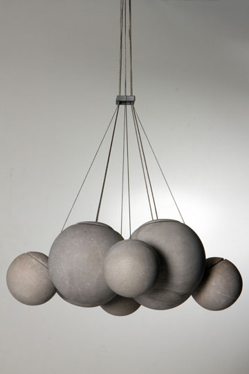 אשכול כדורי בטון בקטרים שונים, המחוברים באמצעות כבלי פלדה לתקרה. הכדורים המקובצים יחד "תופסים" ביניהם את הבגד, וכך נוצר הרושם שהמעילים מרחפים באוויר. 1,700 שקל בהזמנה מיוחדת, באתר Hu.be Studio (אבי בן סימון, שחר יעקבי ונדב גן)