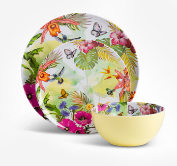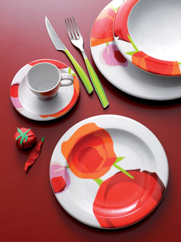 המותג האיטלקי Bugatti מציע מערכת של 24 כלי אוכל, בפרחים גדולים ואדומים. מ-59 שקל לצלחת עד 1,490 שקל לסט כולו, ב''מליס'', ''האוס+'', ''דומו'' ועוד.