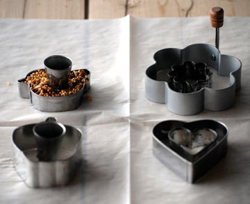 2. בינתיים, מסדרים על נייר אפיה את חותכני הצורות בזוגות. מניחים את החותכן הקטן במרכז החותכן הגדול, כך שייווצר מרחק של כ-ס"מ ביניהם.