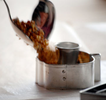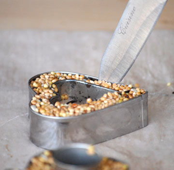 5. ממלאים את הצורה שהתקבלה בעזרת שתי כפיות בתערובת הגרעינים והזרעים עד לקצה העליון של החותכן.