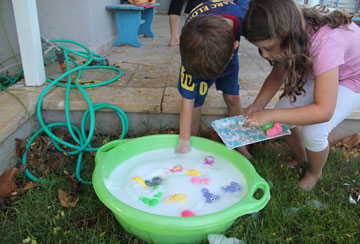 ממלאים גיגית קטנה במים והרבה סבון נוזלי, ויוצרים המון קצף. אפשר לשכשך רגליים ואפשר לזרוק פנימה כל מיני חפצים, ולתת לילדים לחפש אותם בין כל בועות הסבון.