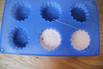 3. יוצקים את הסבון לתוך תבנית סיליקון (אנחנו בחרנו בתבנית פרחים). חשוב לא להשתהות שכן הסבון מתקשה במהירות. אם לא הספקתם, ניתן לחמם שוב את הסבון.