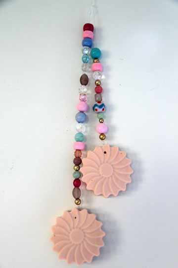 7. מסלקים את חוט הברזל או השיפוד, ושולפים את הסבונים מהתבנית. משחילים חוט וקושרים. משחילים חרוזים.