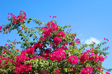 - הבוגנוויליה שייכת למטפסים ירוקים שמרימים צבע ופריחה כלפי מעלה, לגובה. רוב המטפסים פורחים בעונות מסוימות אבל צבעם הירוק נשמר לאורך כל השנה. הבוגנוויליה שומרת על תקופת פריחה ארוכה ביותר מכל צמחי הנוי. היא יפה מאוד בחודשים החמים ופורחת מהאביב עד הסתיו. אין מטפס שפורח זמן רב יותר ממנה. עם זאת, פריחתה הנושרת מלכלכת מאוד את השטח ומי שמחפש לצמצם את ההשקעה בטיפול בגינה לא יאהב את נוכחותה.