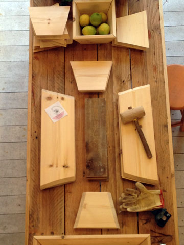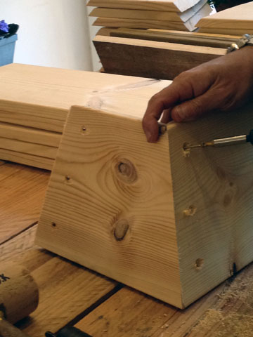 - 2 לוחות עץ אורן טרפזיות חתוכות לפי מידות ובזוויות 45 מעלות בשני הצדדים: רוחב עליון 25.5 ס"מ, רוחב תחתון 15 ס"מ, גובה 20 ס"מ