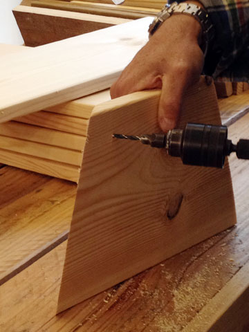 2. כדי לחבר בין הלוחות יש לקדוח חור מקדים, אלכסוני. התחילו בקידוח אנכי ללוח. אחרי שהמקדח מתיישב בחור, סובבו בזווית של כ-45 מעלות על מנת לקדוח את החור.