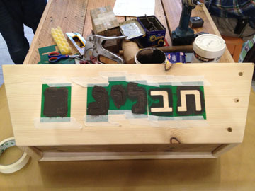 עכשיו, משהאדנית מוכנה, ניתן לרשום עליה בעזרת שבלונה של אותיות וצבע עץ.