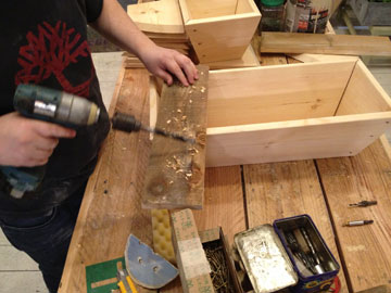 5. לפני שמוסיפים את התחתית, חשוב לקדוח שני חורי ניקוז. את התחתית מחברים באמצעות דבק לעץ. מספר נקודות דבק לאורך הלוח מספיקות כדי להחזיק את התחתית.