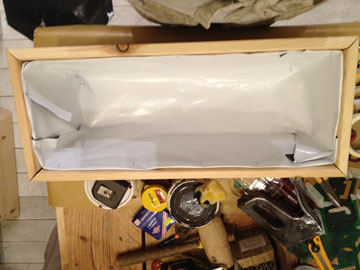 - 2 לוחות עץ אורן טרפזיות, חתוכות לפי מידות ובזוויות 45 מעלות בשני הצדדים: רוחב עליון 60 ס"מ, רוחב תחתון 51 ס"מ, גובה 20 ס"מ