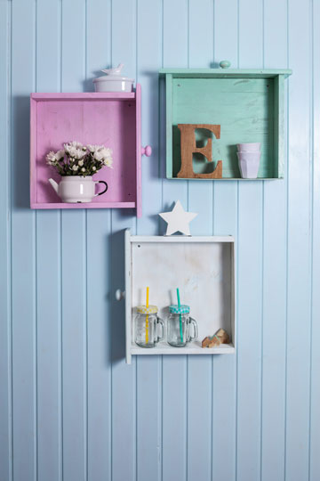 משייפים את המגירות, מרססים אותן בצבע ספריי, רצוי לצבוע כל מגירה בצבע שונה. תולים אותן על הקיר בקומפוזיציה מעניינת. מניחים בתוכן חפצי נוי ומתחדשים במראה מקורי לקיר.