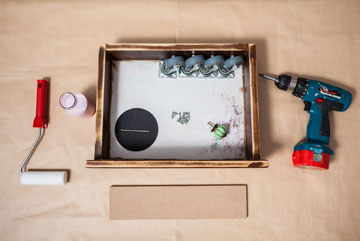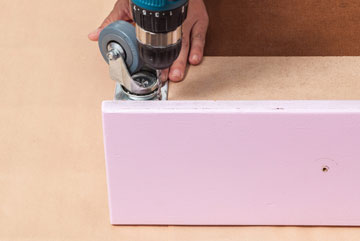 4. הופכים את המגירה, ממקמים את ארבעת הגלגלים בכל אחת מפינות המגירה וקודחים בעדינות חורים קטנים בהתאם למבנה הגלגל. מבריגים את הברגים.