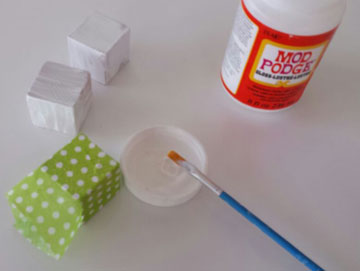 3. מורחים שכבה דקה של דבק מפיות על הקוביה. מפרידים את שכבות המפית, ומדביקים רק את החלק המאויר על הקוביה. עוטפים כפי שעוטפים מתנה,