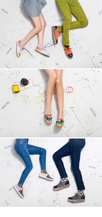 הצבעוניות. כבר בכניסה לחנות לוכדת את העין הצבעוניות השמחה. שילובי הצבעים והחיבורים שעושה ארמה, לעתים בדגם אחד, שונים מאוד מהתוצרת המוכרת של מעצבי הנעליים המקומיים. נראה כי אינו חושש לשחק בפלטת הצבעים, והדבר בולט במיוחד בקו הכפכפים שעיצב יחד עם מעצבת הטקסטיל אדווה ברונר, שסורגת מחוטי עור צבעוניים את רצועת הכפכף. שילובי הצבעים של החוטים מייצרים מראה מקורי וייחודי, שאין שני לו. המחירים, אפעס, בהתאם: 850 שקל לזוג כפכפים.
