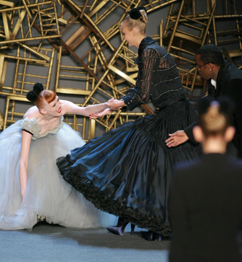 איך: לבושה שמלת ערב עתירת בד ועמוסה שכבות של טול, מעדה הדוגמנית האדמונית קארן אלסון שניות ספורות לאחר שעלתה על המסלול. בעזרת הדוגמנית שפסעה מולה והושיטה לה יד, אלסון קמה מחויכת. בסוף התצוגה היא כבר התהלכה חבוקה בזרועותיו של פוזן, שתמך בה (תרתי משמע) לכל אורך המסלול.