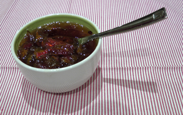 4. מביאים לרתיחה על אש גבוהה ומנמיכים את האש. ממשיכים לבשל כשעתיים על אש קטנה מאוד, כשכל כמה דקות בוחשים את הריבה, עד שהיא מסמיכה.