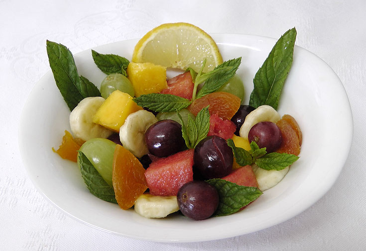 • פירות חתוכים לקוביות: ענבים ירוקים, ענבים שחורים, מנגו, בננות, תפוחים, אגסים