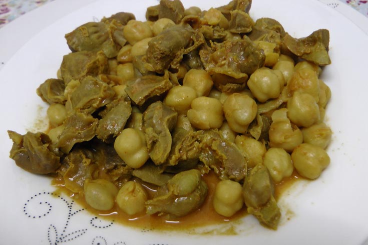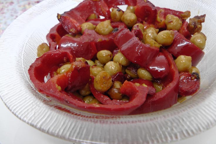 סלט חם של גרגירי חומוס משומרים וגמבה