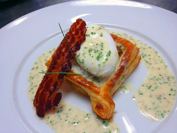 המסע אל עבר הביצה המושלמת עובר דרך מנה קטלנית של מאפה בצק עלים (וול או ואן - Vol au vent) ממולא בדוקסל פטריות, ביצה עלומה, רוטב סופרם (המבוסס על ציר עוף סמיך) ובייקון צלוי - הצרפתים האלה הורגים אותי עם כמויות החמאה והשמנת שהם דוחפים לכל מנה. העורקים הישראליים שלי לא בנויים לזה.