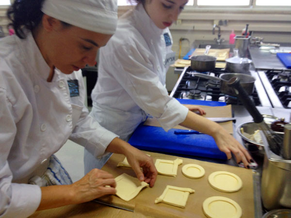 המשחק הזה עם הביצים משעשע אותי מאוד ואני מוצאת את עצמי מתמסרת לו לחלוטין; ביצה ועוד ביצה ועוד אחת, עד שאני לוכדת אחת טוב טוב ואומרת לה: "את תהיי האחת". אני מעבירה אותה לאמבט מים חמים כדי שתהיה בטמפרטורה הנכונה כשנגיש אותה לשפים (הם יבדקו זאת עם מדחום!) ועוברת לקטע הבתיה עוזיאלי של השיעור: חיתוך, קיפול ועיצוב הבצק. עם המאפה העגול אני מסתדרת, אבל האוריגמי של המאפה המרובע גדול עלי: לחתוך ריבוע, לקפל אותו לחצי ושוב לחצי, לחתוך בצדדים אבל לא עד הסוף ואז להעביר את הקצוות לצד אחד ומשם בסלטה סיבובית לצד שני; "בסיידר?" אומר חגי אחרי הדגמה מהירה. נראה לך?