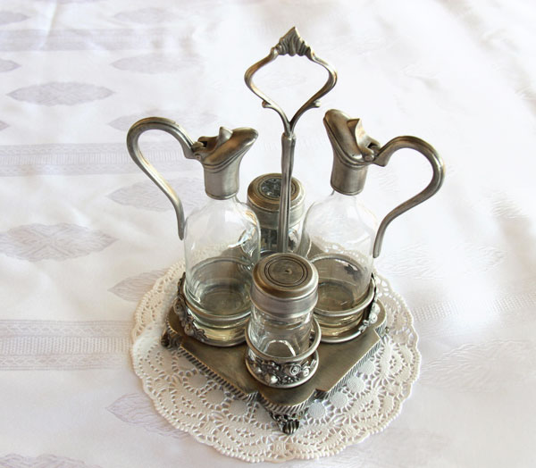 על השולחן במחסן היה מונח סט ישן של בקבוקים מסוגננים לשמן ולחומץ, בתוספת מכלים למלח ולפלפל. כשהדה ראתה אותי מתבוננת בהם היא לקחה את הסט והושיטה לי אותו. "זה סט שיצחק ואני קיבלנו לחתונה לפני יותר מ- 20 שנה", היא אמרה. "עכשיו אנחנו כבר לא משתמשים בו, ויש לי הרגשה שאת תשתמשי בו יותר". הייתי מאושרת. מילאתי את הבקבוקים בשמן ובחומץ, ואת הכלים הנוספים במלח ובפלפל - ובמשך שנים רבות זה היה החפץ היפה ביותר אצלי במטבח הקטנטן.
