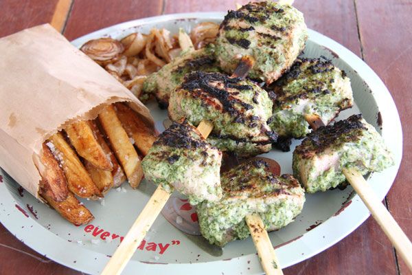 4. משפדים את הבשר וצולים מכל הצדדים - על האש, במחבת פסים לוהטת או מתחת לגריל התנור. חשוב שלא לצלות זמן רב מדי, כדי שהבשר יישאר עסיסי ולא יתייבש.