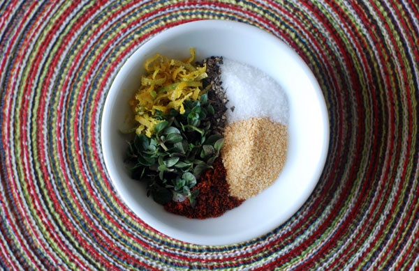 4. מסדרים את הבטטות בתבנית - בשכבה אחת ולא בערימה. מפזרים עליהן את התבלינים באופן אחיד (הכי נוח באמצעות מסננת קטנה) ומניחים מעל את גרידת הלימון ועלי הטימין.